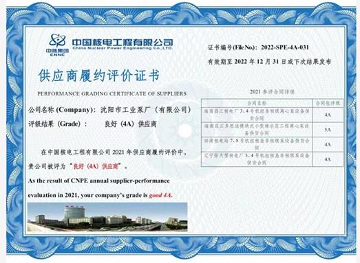 沈陽市工業(yè)泵廠(有限公司)獲得中國核電工程有限公司4A供應(yīng)商履約評(píng)價(jià)